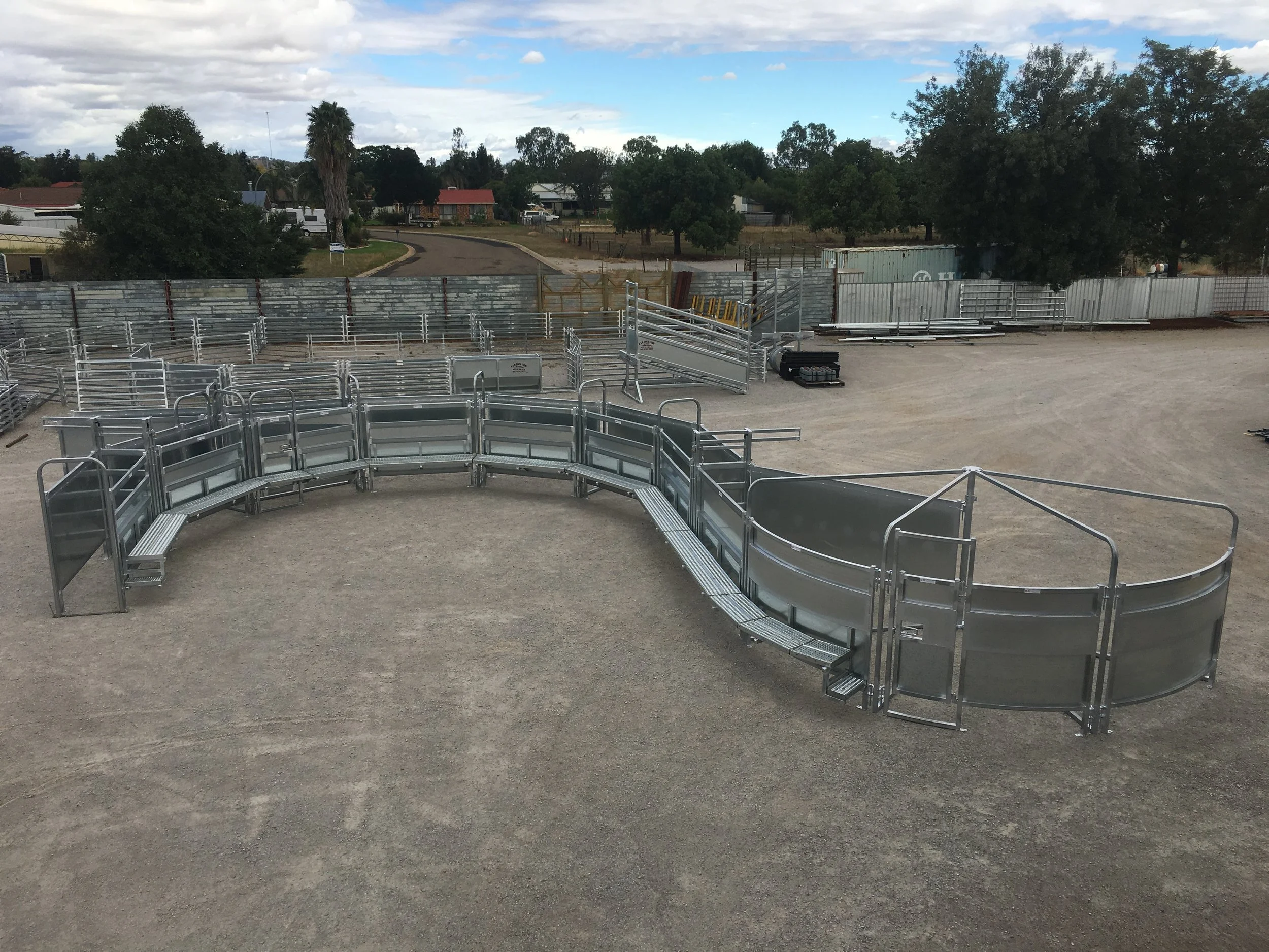 With a total yard area of 1095sq m, this yard system has a working capacity of 420 head and a holding capacity of 842 head. The is custom design is manufactured in 115x42 oval rail with a heavy post upgrade from 1.6mm to 2.5mm thick material. It features a four section Curved Ratcheting Safety Force Yard with a custom sheeted section horse shoe race with walkway. It also features a Leicht’s CIA Stockman Pro-Chute Crush with hot dipped galvanised floor, Gallagher 3500kg weigh bars and a 5.0m heavy duty timber floor loading ramp.